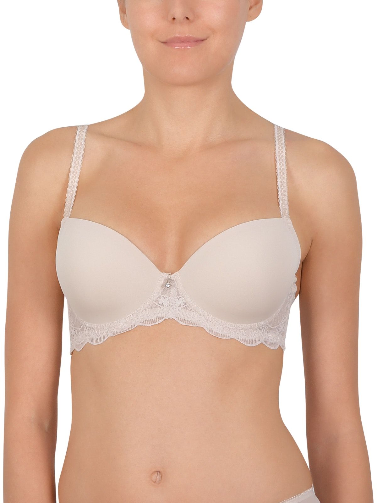Бюстгальтер с гладкими формованными чашками на тонком поролоне, на каркасах. Кружевные боковые панели и спинка продублированы тонкой тюлевой сеткой. На боковых панелях дополнительные стабилизирующие косточки.